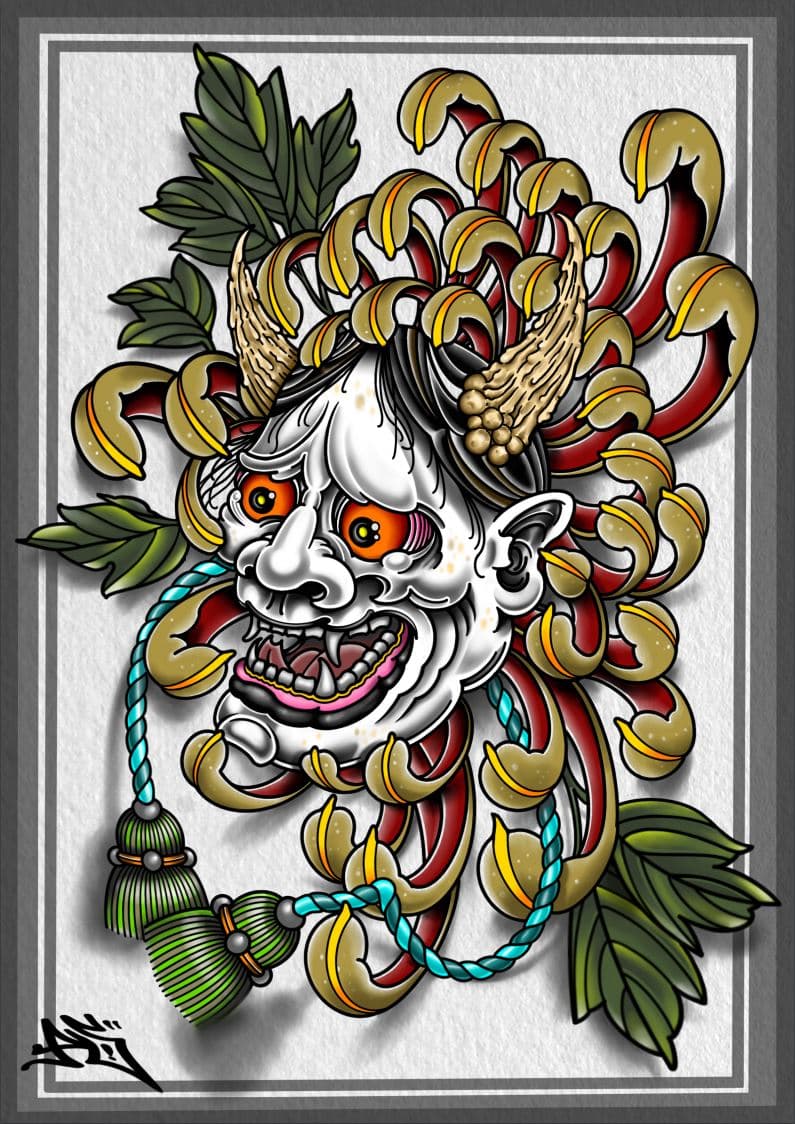 Uusinta uutta Pete Sokuran taidetta! Hannya Mask Crysanthemum on upea taideteos, joka kelpaa seinälle kuin seinälle.